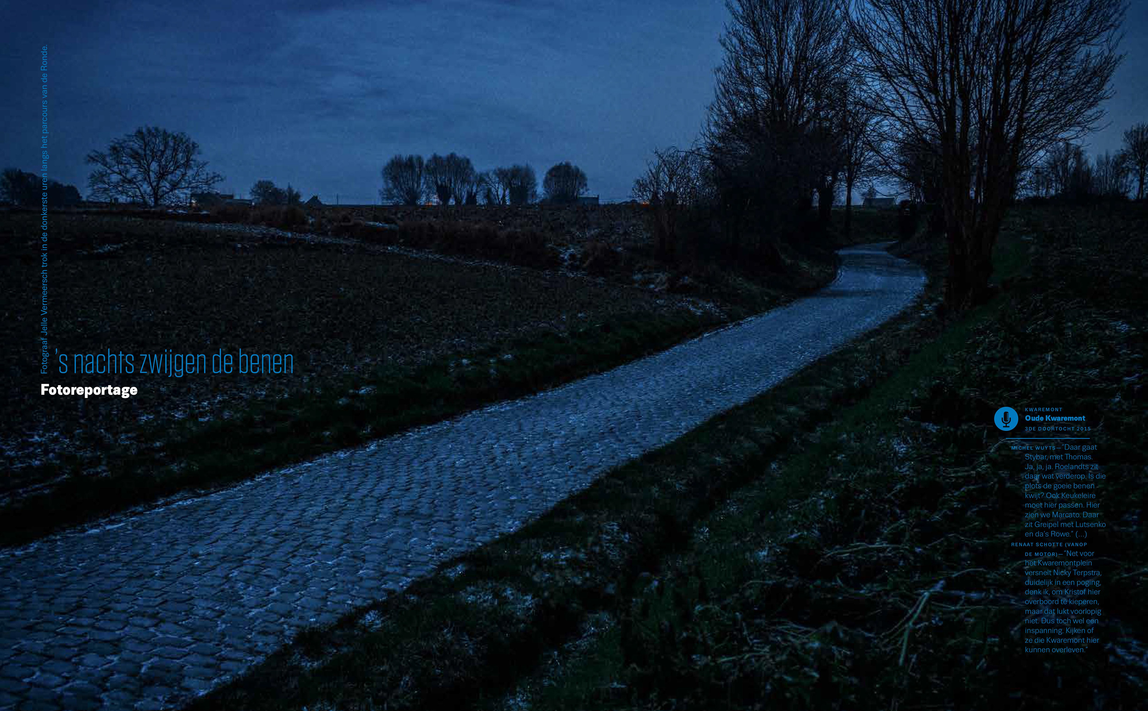 It's a great cliché, but Flanders is synonymous with 'Koers' or the noble sport of cycling, which I lost my heart to. In the winter of 2015 I photographed the famous slopes or 'bergs' for the acclaimed cycling magazine Bahamontes. At night, when the world is quiet and the cobbles await the footsteps of the thousands of supporters and the carbon wheels of the spring classic riders.