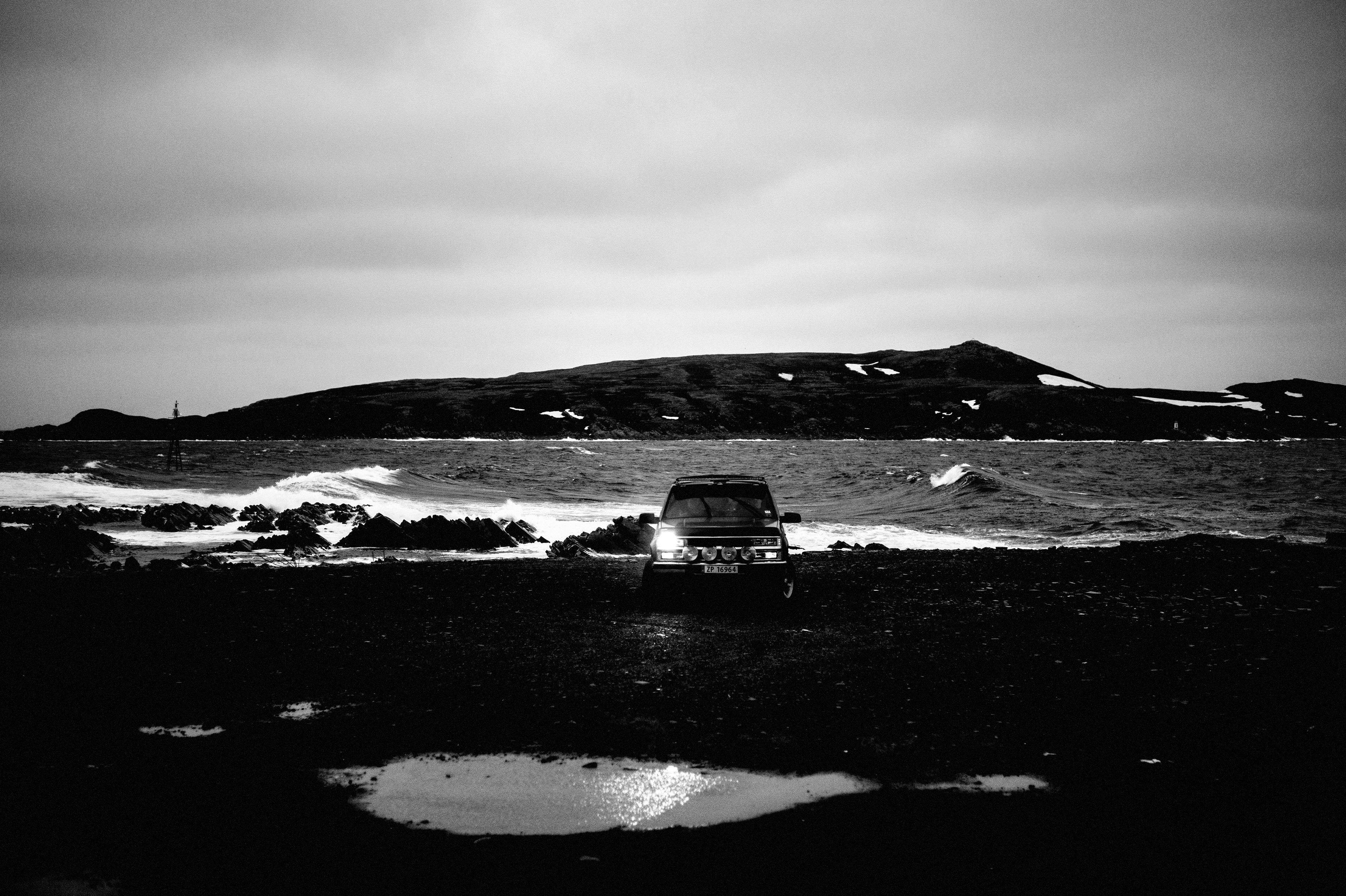 In the violet-pink glow of the midnight sun, mirrored upon still waters in the quiet bay of Vestre Jakobselv.